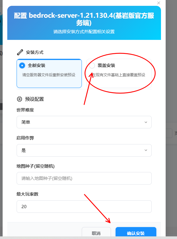 5.特别注意,一定要选择覆盖安装!否则存档会丢失!确认好选择了覆盖安装,点击安装。